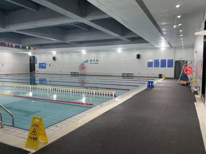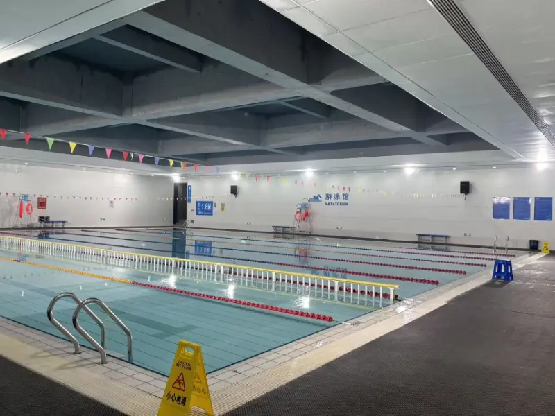 نمای بیرونی استخر دارای یک سیستم پانل فلزی در مقیاس ماهی است که جلوه ای نور و سایه فلس مانند ایجاد می کند که با انحنای نما و جهت نور خورشید تغییر می کند و "جریان آب" را تقویت می کند. کل ساختار سقف محوطه استخر سرپوشیده، با خرپایی به طول 48 متر، با تاکید بر بیان صریح منطق ساختاری و تقویت مقیاس فضایی و حس قدرت مکان ورزشی، در معرض دید قرار گرفته است. این مکان دارای دو استخر است: یک استخر مسابقه و یک استخر تمرین. استخر مسابقه 50 متر طول و 25 متر عرض دارد و دارای 8 خط است. طول استخر 50 متر و عرض آن 17 متر و دارای 6 خط است. هر دو استخر 2 متر عمق دارند.